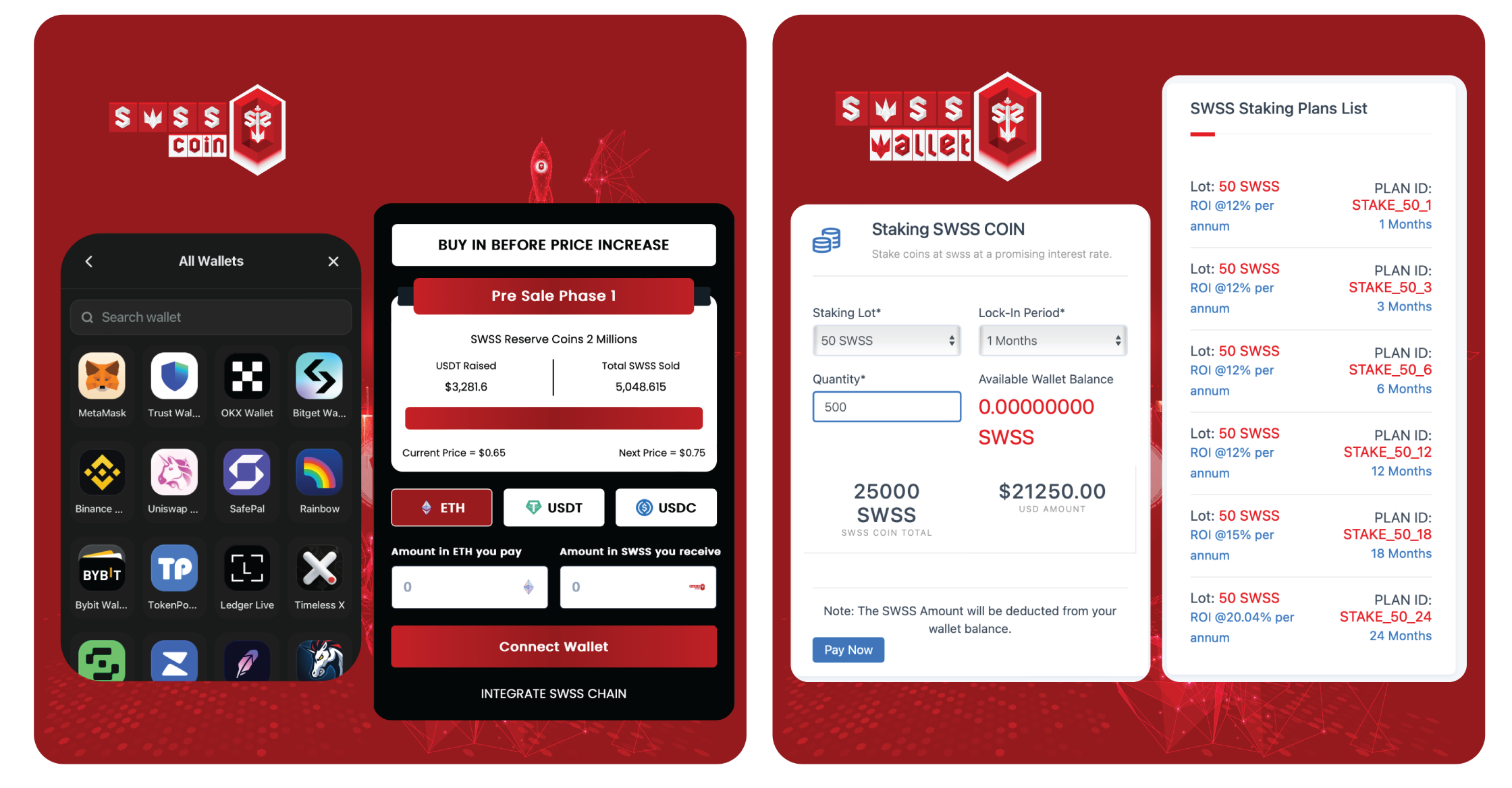 The Decentralized SWSS Wallet is set to launch in Q4 2025 and will be available on both the App Store and Google Play Store. This non-custodial wallet will give you full control over your digital assets, allowing you to securely store, send, and receive SWSS Coin without relying on third parties. All the key features, including staking, instant transfers, and seamless integration with MetaMask, will be available, empowering you with total ownership and security within the SWSS ecosystem.