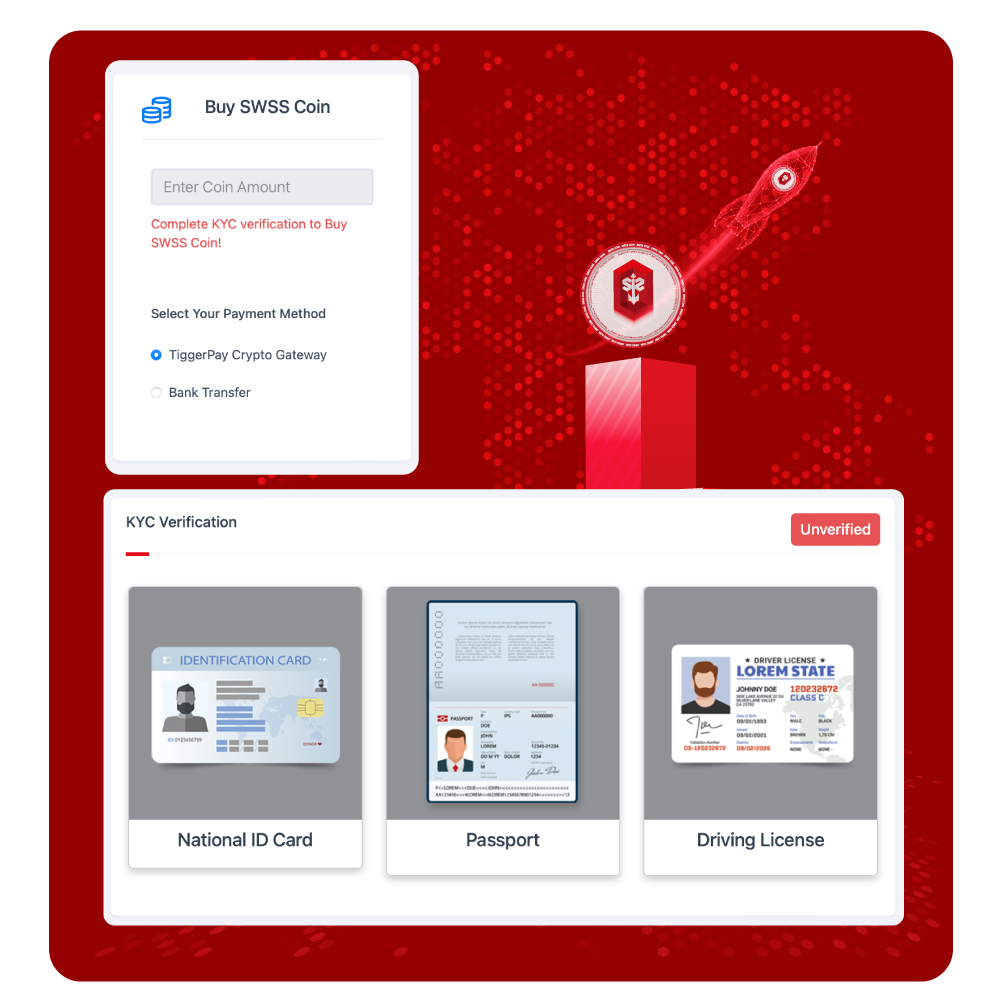 To purchase SWSS Coin, you’ll need to complete a simple KYC (Know Your Customer) verification process, ensuring the security and legitimacy of all transactions within the SWSS ecosystem. This process is designed to protect both users and the platform by verifying your identity, helping prevent fraud and ensuring compliance with regulatory standards. Once your KYC is approved, you’ll have full access to purchase SWSS Coin and participate in the wide range of opportunities within the SWSS Chain, including staking, real estate tokenization, and more.
